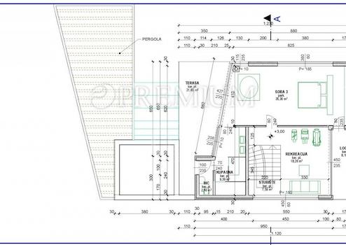 Das Haus, gebaut auf einem Grundstück von 550 m2, hat 240 m2 Wohnfläche und besteht aus Erdgeschoss und Obergeschoss. Im Erdgeschoss gibt es einen Flur, eine Küche mit Esszimmer, ein Wohnzimmer, zwei Schlafzimmer mit eigenen Badezimmern und überdachten Terrassen, eine Toilette, einen Abstellraum und eine Treppe, die in den ersten Stock führt, wo sich ein weiteres Schlafzimmer befindet. Bad, WC, Aufenthaltsraum, Loggia und geräumige Terrasse von 21,63 m2.