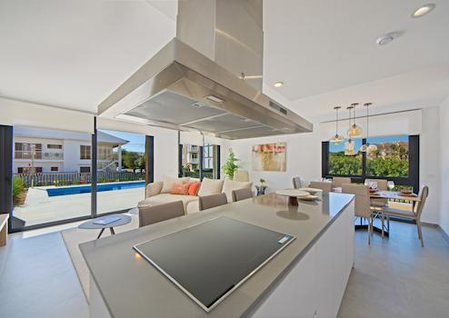 Die Doppelhaushälften der Anlage verfügen über drei Schlafzimmer und drei bis vier Badezimmer, eines als Bad en suite. Davon befindet sich ein Schlafzimmer und ein Badezimmer im Erdgeschoss. Im Obergeschoss befindet sich der Master-Bedroom mit Zugang zu privaten Terrasse. Das Zentrum der Wohnung bildet der großzügige Wohnbereich mit angrenzender offener Küche inklusive hochwertiger Einbauküche. Der Wohnbereich bietet einen direkten Zugang auf die große Terrasse und den angrenzenden privaten Garten. Der Garten bietet eine Fläche zwischen 180 qm und knapp 360 qm.