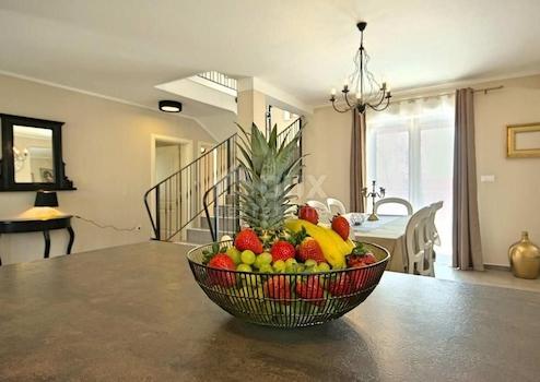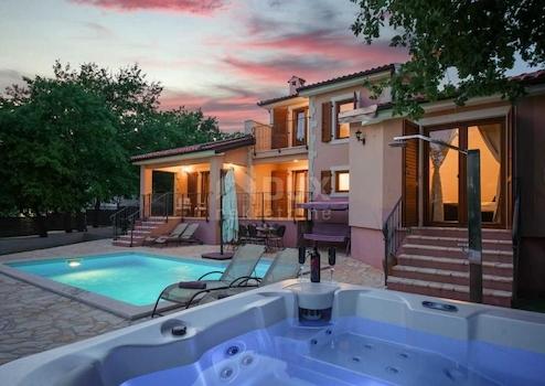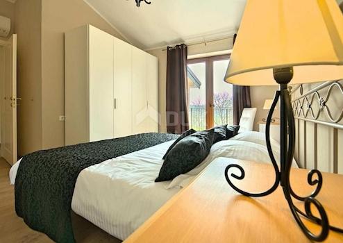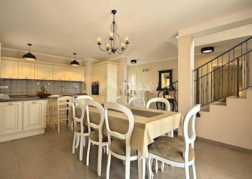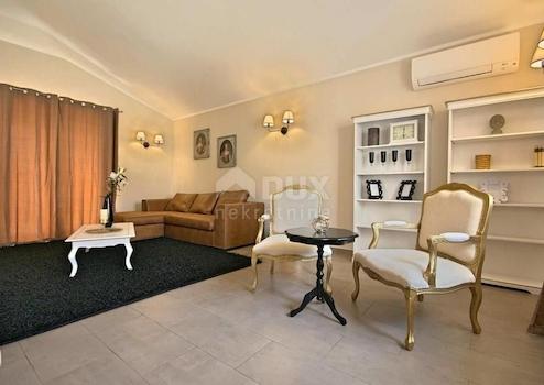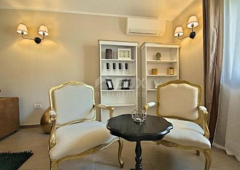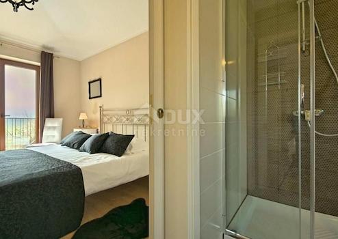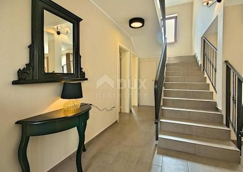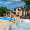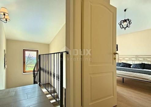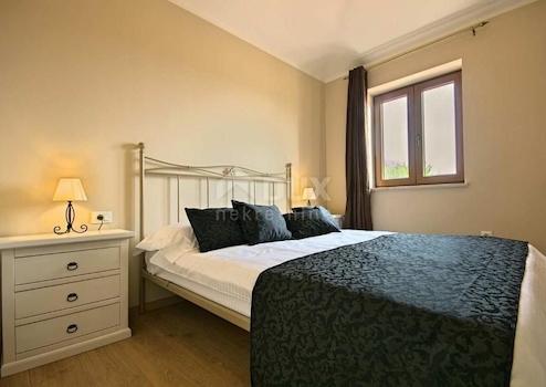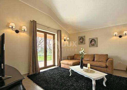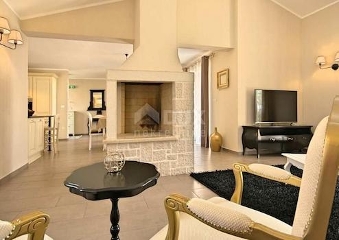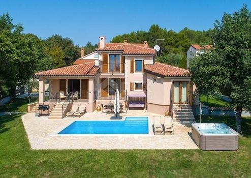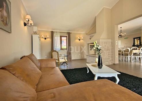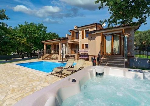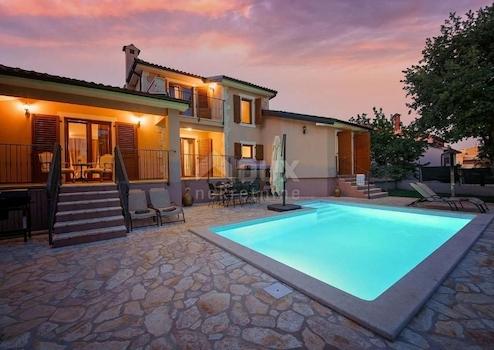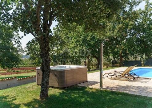 Äußerst komfortable und luxuriöse Landvilla mit Swimmingpool am Rande des Dorfes im Hinterland von Poreč. Das Haus wurde 2016 erbaut und befindet sich in äußerst ruhiger Lage, umgeben von einem Eichenwald und mit Blick auf Felder und einen Olivenhain. Auf einem eingezäunten Grundstück von 820 m² bietet diese Schönheit einen Außenpool von 24 m², einen Whirlpool für 5 Personen, einen Tisch mit Stühlen zum Essen für 8 Personen, einen Grill und 3 Parkplätze. Die Villa hat eine Fläche von 165 m² auf zwei vollklimatisierten Etagen. Im Erdgeschoss finden wir ein gut ausgestattetes Wohnzimmer mit einer ausgestatteten Küche, einem Esstisch und einem Wohnzimmer mit Ledermöbeln, offenem Kamin und SAT-TV, ein Zimmer mit eigenem Bad, ein weiteres Zimmer mit eigenem Bad mit Zugang zur Terrasse und ein Gäste-WC. Im ersten Stock des Hauses befinden sich zwei Zimmer mit einem gemeinsamen Bad mit Zugang von beiden Zimmern, eines der Zimmer hat einen Balkon. Bedenkt man, dass die Villa während der touristischen Saison ein gut etabliertes Vermietungsgeschäft hat, kann sie als hervorragende Investition dienen, aber auch als kleines Paradies für diejenigen, die ihre 4 Wände gerne in Ruhe genießen möchten.