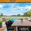 Der Garten ist mit viel Liebe zum Detail gestaltet, um den Aufenthalt im Haus so entspannt und angenehm wie möglich zu gestalten. Rund um den Außenpool gibt es Liegestühle, ein überdachtes Esszimmer mit Grill und ein überdachtes Wohnzimmer. Der Außenbereich ist so konzipiert, dass Sie morgens Kaffee/Tee und Frühstück genießen, aber auch abends mit Blick auf den Sonnenuntergang entspannen können.