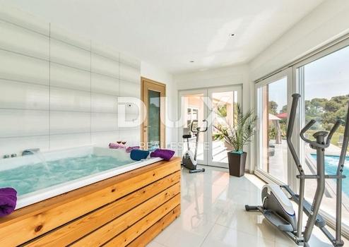 Auf dem Rasen gibt es Fußballtore, ein Trampolin, eine Schaukel und einen Kamin. Im Erdgeschoss befindet sich ein geräumiges Wohnzimmer mit Küche und Esszimmer in modernen Linien mit Zugang zu einer großen Terrasse von 100 m2, auf der sich Gartenmöbel und ein Pavillon befinden. Es gibt auch einen Wellnessbereich im Erdgeschoss mit Blick durch große Glaswände auf den Pool, die Terrassen und das Grün. Der Pool mit Hydromassage ist 48 m2 groß. Ein Teil ist für Kinder 0,5 m tief und der andere für Erwachsene 1,5 m tief.