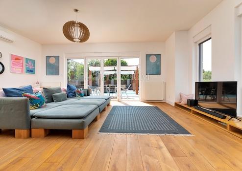 Im Erdgeschoss befinden sich ein Eingangsbereich, eine Toilette mit Waschküche, ein Hobbyraum, der derzeit als Fitnessraum genutzt wird, sowie ein großzügiges, offenes Wohnzimmer mit einem Esszimmer und einer Küche mit Zugang zur Terrasse und einem gepflegter Garten von 1249 m2, wo es eine Liegewiese gibt. Baldachin, Grill und Swimmingpool. Darüber hinaus gibt es auf dem Grundstück eine Garage für zwei Autos.