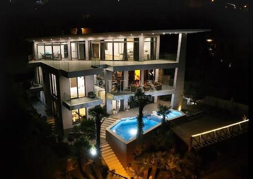 Die erste Etage besteht aus zwei Schlafzimmern mit jeweils eigenem Bad, einer Gästetoilette, einer Küche, einem großen Wohnzimmer und einer Terrasse mit Panoramablick auf das Meer.
