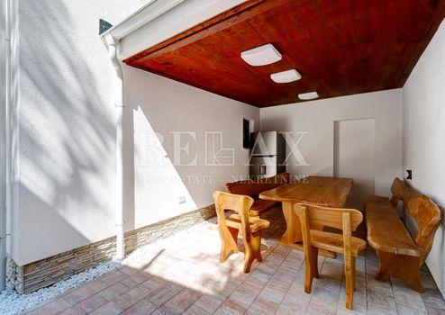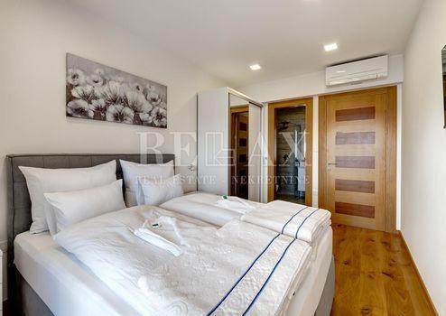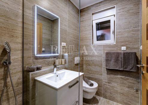 Im Erdgeschoss des Hauses gibt es ein Schlafzimmer mit eigenem Bad, eine Toilette, eine offene Küche mit Wohnzimmer und einen Ausgang zu einer überdachten Terrasse, vor der sich ein Swimmingpool mit Liegewiese und schöner Aussicht befindet auf das Meer und die Insel Krk.
