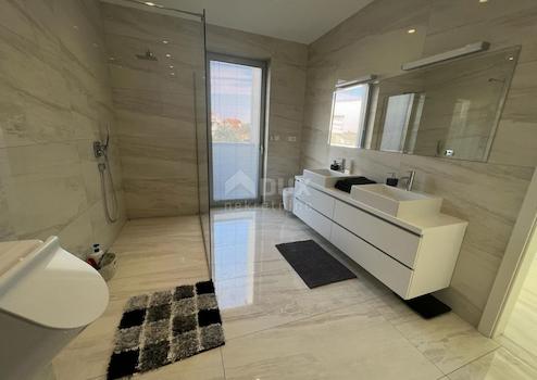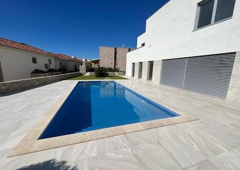 Diese einzigartige Villa befindet sich in einer wunderschönen Lage in der Stadt Krk, nur 500 Meter vom Meer entfernt. Es wurde auf einem Grundstück von ca. 750 m2 gebaut und hat eine Fläche von 400 m2. Im Erdgeschoss gibt es eine Garage für zwei Autos, ein Badezimmer, zwei Abstellräume, ein Wohnzimmer, eine Küche und ein Esszimmer, von dem aus Sie auf einen wunderschön angelegten Garten und eine große Terrasse mit einem Swimmingpool von 44 m2 zugreifen können ein Sonnendeck. Im Obergeschoss befinden sich drei Schlafzimmer mit eigenem Bad und Terrassen mit wunderschönem Blick auf das Meer. Das Hauptschlafzimmer verfügt außerdem über einen separaten Bewegungsbereich, der bei Bedarf in einen anderen Raum unterteilt werden kann. Im Untergeschoss befinden sich eine Toilette, ein Heizraum, ein Abstellraum, eine Küche, ein Esszimmer und ein großer Raum für Geselligkeit, mit der Möglichkeit, den Raum nach den Wünschen des Investors umzubauen. Neben dem Bereich für Geselligkeit gibt es einen Bereich, der für eine Weinhandlung bestimmt ist. Vom Keller aus gibt es auch Zugang zu einer weiteren Terrasse. Der Zugang zu Autos ist von zwei Seiten möglich. Im Gebäude wurden hochwertige Materialien verbaut, eine Fußbodenheizung über eine Wärmepumpe, alle Räume sind klimatisiert und auf dem Dach wurden Solarkollektoren zur Wasser- und Poolheizung platziert. Diese Villa fällt durch ihr modernes Erscheinungsbild und ihre Lage auf.