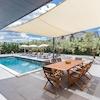 Neben dem Swimmingpool mit Liegewiese und Whirlpool verfügt die Villa auch über eine überdachte Terrasse, einen Grill und einen gesicherten überdachten Parkplatz für zwei Autos.