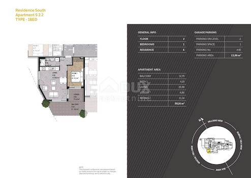 Eine EINZIGARTIGE WOHNANLAGE mit Tiefgarage und eigener Infrastruktur mit reichhaltiger Begleitausstattung befindet sich in begehrter Lage mit freiem Blick auf die Kvarner Bucht und Opatija, nur wenige Gehminuten vom Meer und den Stränden entfernt und somit eine echte Rarität auf dem Markt. Der Wohnteil des Komplexes ist in 3 separate Eingänge unterteilt und verfügt über insgesamt 58 Luxusapartments mit unterschiedlichen Quadratmetern, die eine einzigartige Kombination aus überlegener Ästhetik mit hohem Komfort und Funktionalität darstellen. Die meisten Wohnungen haben einen offenen Blick auf das Meer und Opatija, und einige Wohnungen haben auch private Gärten. Der öffentliche Teil des Komplexes umfasst eine Lobby, ein Restaurant und eine Lounge-Bar, einen Außenpool mit Terrassen mit Sonnenliegen, ein Fitnessstudio und ein SPA-Center, einen Plodine-Supermarkt, eine DM-Drogerie, eine Apotheke und einen landschaftlich gestalteten Stadtgolfplatz. Die Wohnungseigentümer haben einen 24-Stunden-Concierge- und Sicherheitsdienst sowie einen Zimmerservice, der vom Restaurant Bevanda bereitgestellt wird. WOHNUNG S2.2 - Gesamtfläche 59,16 m2, im 2. Stock gelegen, nach Süden ausgerichtet, mit Blick auf das Meer und Opatija. Es besteht aus einer Eingangshalle, einem Wohnzimmer mit Küche und Esszimmer, einem Schlafzimmer, einem Badezimmer, einer Loggia von 4,86 m2 und einem Balkon von 12,79 m2. Zur Wohnung gehört auch 1 Garagenstellplatz Nr. 46 von 12,9 m2 auf -1 Etage.