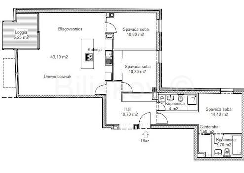 Die Wohnung besteht aus einem grossen Wohnzimmer mit integrierter Küche und Esszimmer und Zugang zur Loggia, zwei kleineren Schlafzimmern, einem Hauptschlafzimmer mit Bad und Kleiderschrank, einem zusätzlichen Bad und einem Flur.