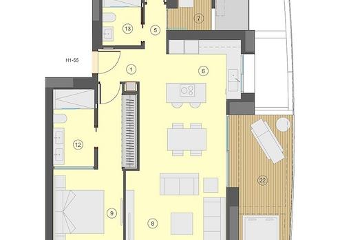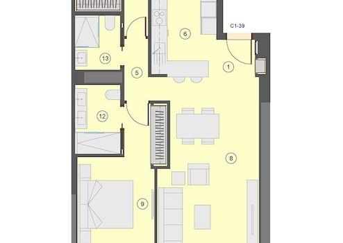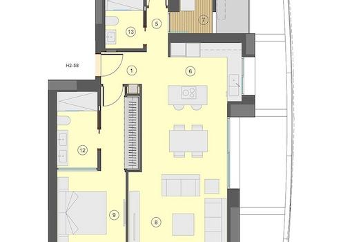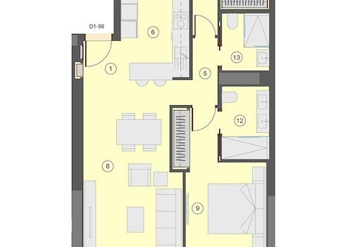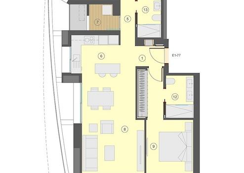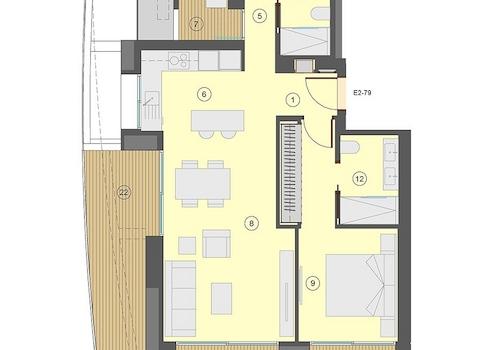 Die Wohnanlage besteht aus einem 30-stöckigen Turm und einem 40-stöckigen Turm und beide sind nach Süden ausgerichtet. Die Wohnungs-Typologien sind sehr vielfältig, Sie können zwischen Excellence-Wohnungen mit 1, 2 oder 3 Schlafzimmern und mit 1 oder 2 Badezimmern und Premium-Wohnungen mit 2, 3 oder 4 Schlafzimmern mit 2 oder 3 Badezimmern wählen. Die Wohnungen bieten ein Design, das maximalen Komfort anstrebt und es Ihnen ermöglicht, das Mittelmeer wie nie zuvor zu genießen. Die Terrassen verfügen über Glasgeländer um die fantastische Aussicht nicht einzuschränken. Diese Wohnanlage soll zu einem neuen Wahrzeichen der Skyline von Benidorm werden.