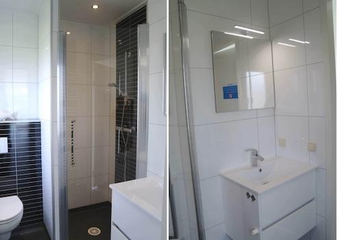 Das luxuriös ausgestattete Badezimmer verfügt über ein Waschbecken und einen Spiegel, eine geräumige Duschkabine und eine Toilette. Auch dieser Raum ist durch das Drehkippfenster gut zu belüften.