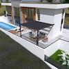 Der äussere Teil der Villa besteht aus einem Swimmingpool mit Liegewiese und einem überdachten Teil mit einer Pergola, wo sich ein Esszimmer im Freien befindet.