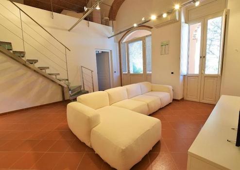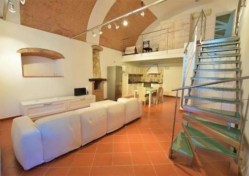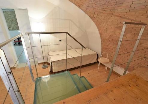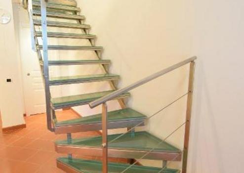 Über eine aus Stahl und Glas bestehenden Treppe erreicht man das Zwischengeschoss, das direkt mit einem kürzlich restauriertem Raum verbunden ist und ebenfalls ein Ziegelsteingewoelbe hat.