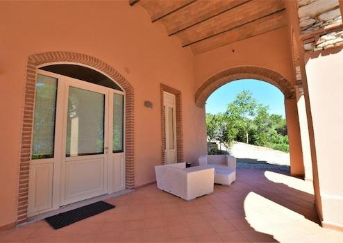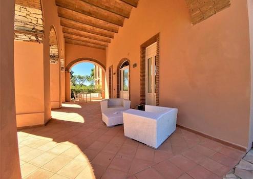 Am Eingang des Hauses befindet sich eine weiträumige 40 qm große Veranda mit Blick auf das Meer, deren Decke aus einem 5 Meter hohen Ziegelsteingewölbe besteht.
