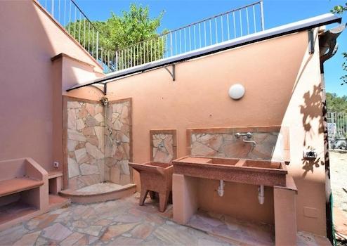 Gleich daneben befindet sich ein mit einer Außen-Dusche und einem großen Marmorwaschbecken ausgerüsteter Bereich.