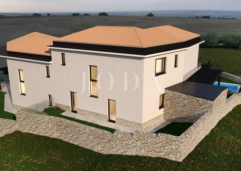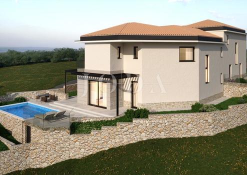 Eine schöne Villa zum Verkauf in attraktiver Lage in der Nähe des Meeres in Vrbnik. Die Fläche der Villa beträgt 187m2. Die Villa wird auf einem Grundstück von 412 m2 gebaut und besteht aus zwei Etagen. Im Erdgeschoss befinden sich ein gemütliches Wohn- und Esszimmer, eine Küche, ein Eingangsbereich mit Treppenhaus, ein Zimmer mit Waschküche, ein Technikraum, ein Schlafzimmer und ein Badezimmer. Im Obergeschoss befinden sich drei geräumige Schlafzimmer, jedes mit eigenem Bad, Vorraum, überdachtem Balkon und überdachter Terrasse. Überlegene Konstruktion und Ausstattung. Es gibt einen Swimmingpool, einen Abstellraum und zwei Parkplätze im Garten.