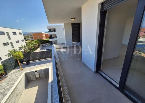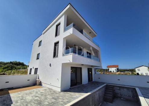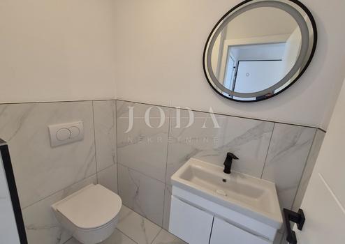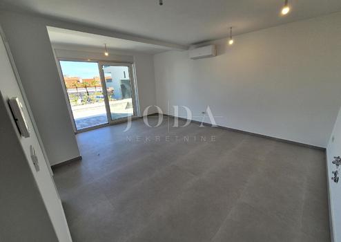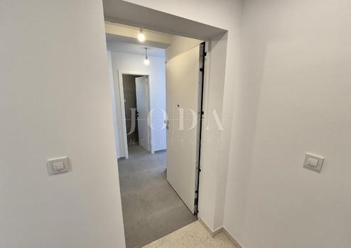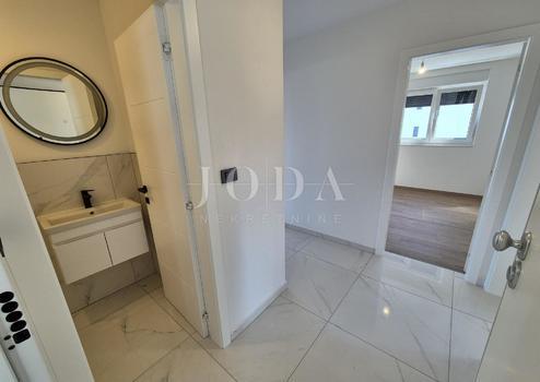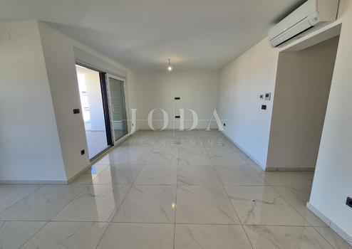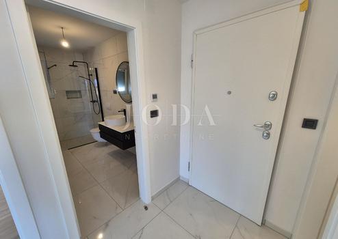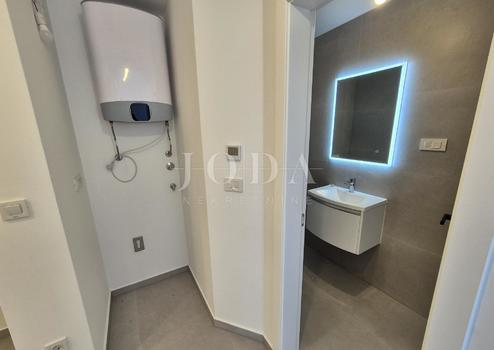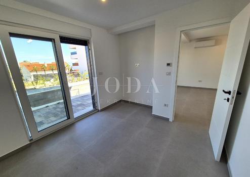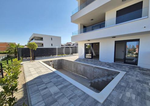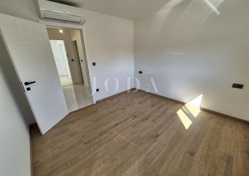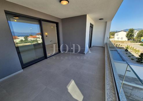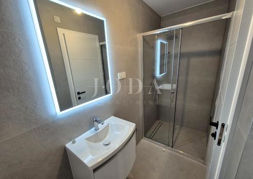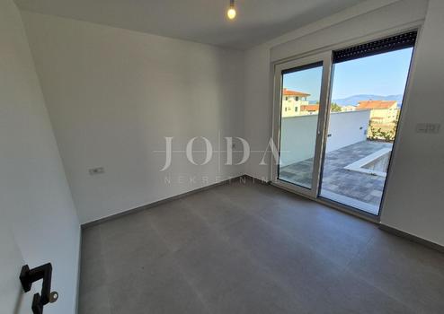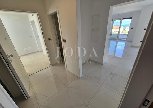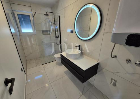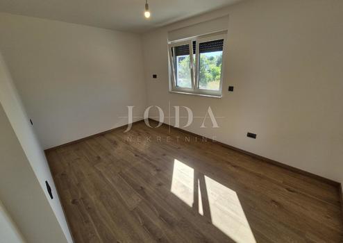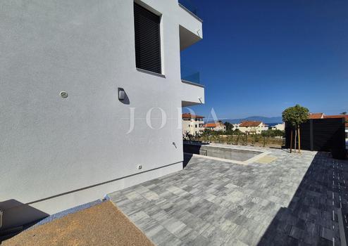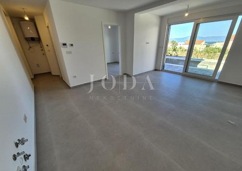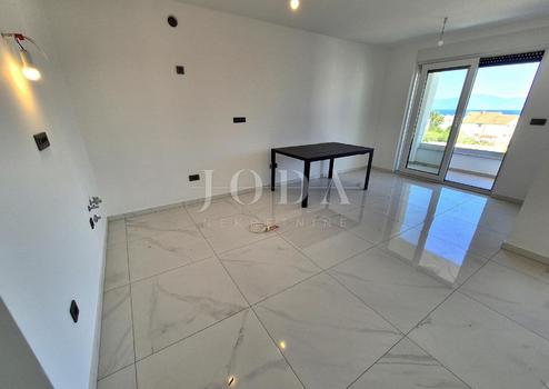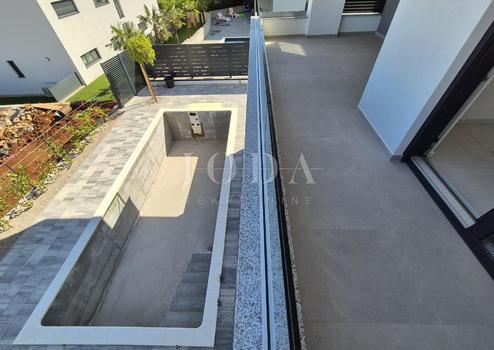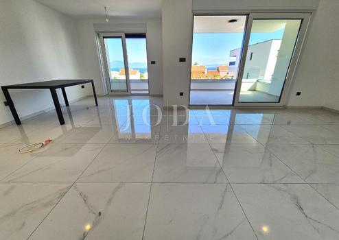 Die Wohnung besteht aus zwei Teilen, der erste Stock ist 77,19 m2 groß, besteht aus zwei Schlafzimmern, einem Badezimmer, einer Toilette, einem offenen Raum, der Wohnzimmer, Küche und Esszimmer vereint, und einem großen Balkon mit Meerblick. Der zweite Teil der Wohnung befindet sich im Erdgeschoss, verfügt über einen separaten Eingang und ist in der Natur eine separate Wohneinheit. Die Erdgeschosswohnung von 43,70 m2, besteht aus einem Schlafzimmer, Badezimmer, Küche mit Essbereich und einem Garten in dem sich ein 24 m2 großer Swimmingpool befindet.