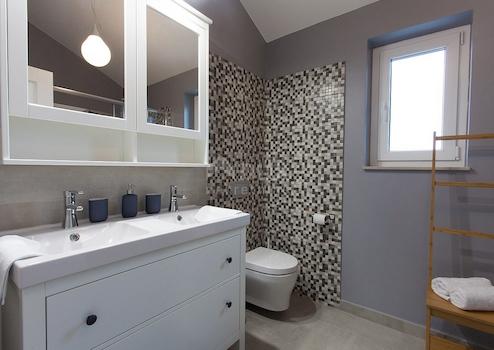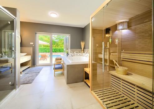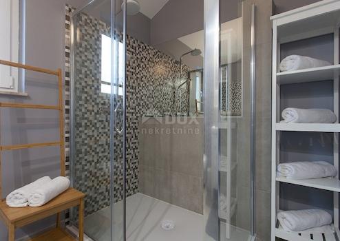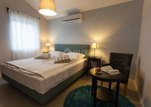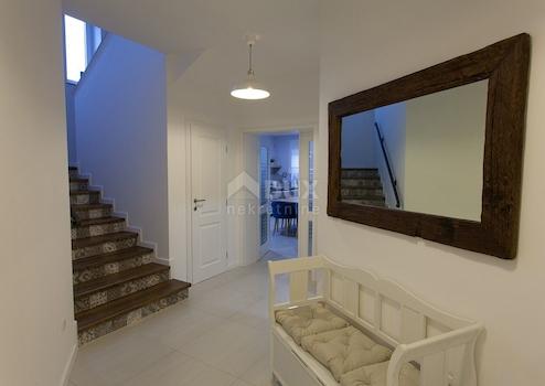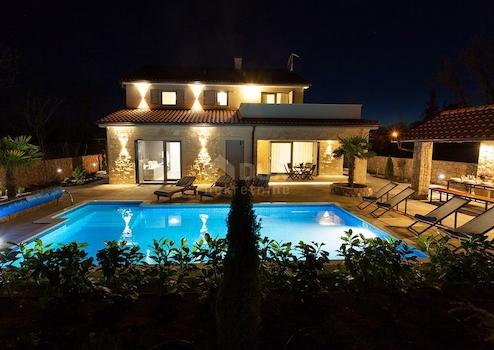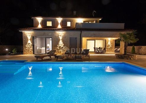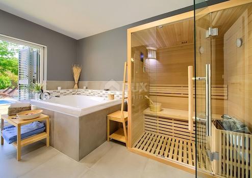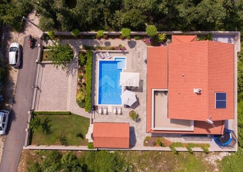 Freistehende Villa mit einer Größe von 185 m2, rustikalem Äußeren und modernem Interieur mit einem schönen großen Garten und Swimmingpool, in ruhiger Lage am äußersten Rand der Grünzone gelegen , nur 5 km vom Meer entfernt. Es besteht aus einem Erdgeschoss mit einem Eingangsbereich, der zu einem Mini-Wellnessbereich (Sauna und Whirlpool) führt, einem Schlafzimmer, einem offenen Bereich mit Küche, Esszimmer und Wohnzimmer mit Zugang zur Terrasse sowie einer Waschküche und ein Heizraum. Im Obergeschoss befinden sich drei Schlafzimmer und zwei Badezimmer. Sie ist komplett mit allem ausgestattet, was eine Villa braucht. Es verfügt über hochwertige Keramik- und Sanitärartikel, PVC-Zimmerarbeiten, wird mit einer Wärmepumpe (8 Gebläsekonvektoren) beheizt/gekühlt und verfügt über Sonnenkollektoren für Warmwasser. Der Strom im Haus ist mit 22 KW vermietet, es verfügt über Strom zum Laden von Elektrofahrzeugen, einen internen Kamin, der mit einer Wärmepumpe zum Heizen des gesamten Hauses verbunden ist, die Beheizung des Außenpools, die Steuerung der Heizung/Kühlung und des Pools über einen mobile Anwendung, Außengrill, Bewässerung, komplette Beleuchtung von Haus und Garten, Videoüberwachung, Alarmanlage und Zisterne zum Sammeln von Wasser von ca. 50 m3. Der Hof ist 555 m2 groß und verfügt über einen Swimmingpool (32 m2), um den sich eine Liegewiese, ein Whirlpool, eine überdachte Terrasse mit Sommerküche und Grill sowie 3 Parkplätze befinden. Das Haus wird komplett möbliert und ausgestattet verkauft. Es ist für die Touristenvermietung kategorisiert und hat 5 Sterne. Auf der Ostseite der Insel Krk liegt die Gemeinde Dobrinj mit dem gleichnamigen Zentrum. Dobrinj liegt auf einem etwa 200 Meter hohen Hügel und ist eine der mittelalterlichen Burgen, die in der Vergangenheit Zentren der Alphabetisierung waren. Dobrinjština war jahrhundertelang eine äußerst landwirtschaftlich geprägte Region. Auch Tierhaltung und Olivenanbau sowie die Ausbeutung der Waldressourcen waren vertreten. Der Ort ist auch für seine farbenfrohen Trachten, Folkloreveranstaltungen, die Sopela-Schule (Krks Blasinstrument) und die traditionelle lokale Küche bekannt. In diesem Inselzentrum dominieren autochthone Steinhäuser und enge Steingassen, die an die Vergangenheit erinnern. Nicht weit von Dobrinje entfernt befindet sich die Höhle Biserujka, die durch ihre Schönheit und interessante Felsformen begeistert. Es ist die einzige Höhle auf der Insel, von der es mehr als 50 gibt, die für den Empfang von Besuchern konzipiert ist. Der Legende nach wurde die Höhle nach dem darin gefundenen Schatz, der einheimischen Piraten gehörte, Biserujka (Perle) genannt.
