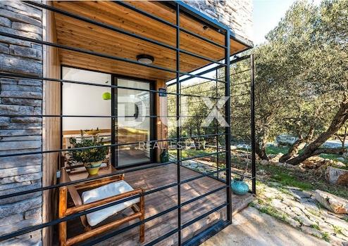 Ein Steinhaus zum Verkauf, 200 Meter vom Meer entfernt, komplett möbliert, mit einer Dachterrasse von 30 m2 mit einem unglaublichen Blick auf das Meer und die Inseln. Das Haus hat insgesamt drei Etagen. Obwohl das Haus komplett aus Stein besteht, macht es das Detail der Holzfassade auf der überdachten Eingangsterrasse im Erdgeschoss noch interessanter. Im Erdgeschoss befindet sich eine Küche mit Esszimmer und eine interne Wendeltreppe führt in den ersten Stock des Hauses, wo sich ein Schlafzimmer und ein Badezimmer mit „begehbarer“ Dusche befinden. Im zweiten Stock befindet sich ein Wohnzimmer, von dem aus eine Treppe zu einer Dachterrasse mit Whirlpool und herrlicher Aussicht führt. Das Haus verfügt über 4 Parkplätze im Garten und die Kombination aus natürlichen Materialien und mediterraner Vegetation im Garten macht dieses Haus ideal zum Entspannen und Genießen, nur wenige Schritte vom Meer entfernt. Da das Haus kategorisiert ist, ist es zur Vermietung bereit. Eine einzigartige Gelegenheit für diejenigen, die die Kombination aus Natur, Meer und Stein lieben.