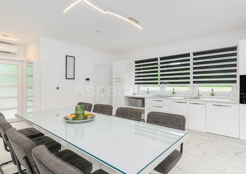 Wir verkaufen eine moderne Villa mit Pool und gepflegtem Garten in sehr ruhiger Lage. Die Villa befindet sich in der Nähe von Vodnjan und hat eine Gesamtwohnfläche von 163 m2 und eine Nettofläche mit Terrassen von 243 m2. Die Gesamtfläche des Grundstücks beträgt 1001 m2. Die Villa besteht aus Erdgeschoss und erstem Stock. Im Erdgeschoss der Villa befinden sich Küche, Esszimmer und ein Wohnzimmer mit einem modernen offenen Konzept/Open-Space-Konzept mit Ausgang zur Terrasse, ein Abstellraum und ein Schlafzimmer mit eigenem Badezimmer, während ich im ersten Stock drei Schlafzimmer mit eigenen Bädern mit Ausgang zur oberen grosszügigen Terrasse befindet. Im Garten der Villa gibt es einen 40 m2 grossen Pool und einen Grill sowie zusätzliche Inhalte wie Tischfussball, Darts und Schaukel. Die Villa wird komplett möbliert verkauft. In der Nähe gibt es ein Restaurant, einen Supermarkt, eine Grundschule und einen Fussballplatz. Die Entfernung von Fažana beträgt 14 km. Die Entfernung von Pula beträgt 19 km.