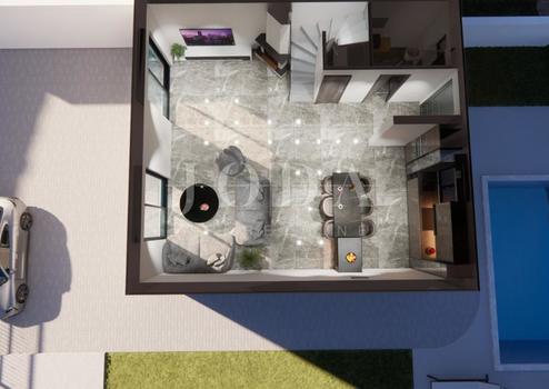 Das Haus mit einer Fläche von 135 m2 erstreckt sich über Erdgeschoss und Obergeschoss. Das Erdgeschoss besteht aus einem Wohnzimmer, einer Küche, einem Esszimmer, einer Toilette, einem Flur und einem Abstellraum. Im ersten Stock befinden sich drei Schlafzimmer und zwei Badezimmer. Im Garten sind ein Swimmingpool, ein überdachter Außengrill und drei Parkplätze geplant.