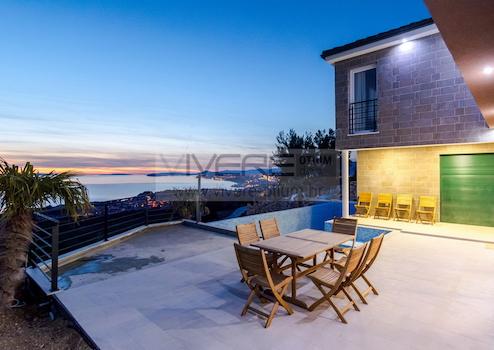 Die Villa wurde aufwendig und mit viel Liebe zum Detail in einen modernen Stil eingerichtet und ausgestattet, was auch die höchsten Ansprüche zufriedenstellt. Das Erdgeschoß mit den Haupteingang zur Villa ist über eine Außentreppe von der Parkebene mit Zufahrt zugänglich. Das Erdgeschoß verteilt sich auf einen offen und lichtdurchfluteten Wohnbereich mit angrenzenden Essbereich, eine abgegrenzte, moderne Küche sowie ein Schlafzimmer mit en suite Bad. Der offene Kamin im Wohnzimmer erzeugt auch an kalten Wintertagen eine angenehme Wohnatmosphäre. Große Glasschiebeelemente führen aus dem Wohnbereich direkt zur Panoramaterrasse mit einem 36 m2 großen Infinity-Pool, welcher von Sonnenliegen umgeben ist. Genießen Sie ein erfrischendes Bad im Pool und gleichzeitig eine außergewöhnliche Aussicht. Hier darf auch der traditionelle dalmatinische Aussengrill nicht fehlen. Genießen Sie Ihre am Grill zubereitete Speisen am Essbereich im Freien mit einer wahrlich Bilderbuchkulisse im Vordergrund. Eine Innentreppe führt ins Obergeschoß, welches zwei großzügige Schlafzimmer mit jeweiligen Badezimmer en-suite bietet. Das größere Schlafzimmer bieten zusätzlich einen direkten Zugang zur überdachten Terrasse, die einen unvergesslichen Meerblick eröffnet. Das Anwesen ist voll klimatisiert und die Zimmer sind sehr geräumig und sonnendurchflutet, was ein Gefühl von absolutem Komfort erzeugt.