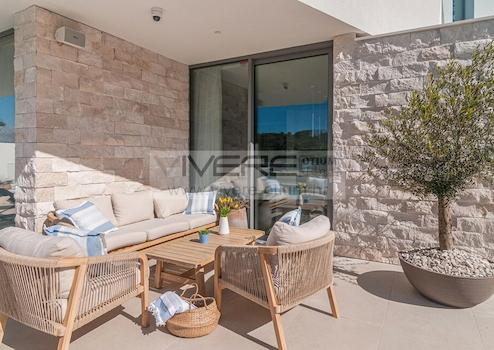Diese einzigartige Designervilla bietet das Beste in Bezug auf Lage, Blick, Bauwerk und Technologie. Das Konzept ist es, eine beeindruckende und dominante Küstenlandschaft mit einen erhöhten sinnlichen Wohnkonzept zu verschmelzen. Die Villa besticht durch das helle und geradlinige Interieur. Über drei Etagen verteilt sich bei dieser vollklimatisierten Immobilie moderner Luxus, kombiniert mit lichtdurchfluteten und offenen Räumlichkeiten. Im Erdgeschoß befindet sich die großzügige offene Designer-Küche und der helle Wohn-/Essbereich mit offenen Billardzimmer mit Bar, der fließend in den Außenbereich mit Terrasse und beheizbaren Pool (32 m²) übergeht. Die Terrasse im Erdgeschoß bietet zudem eine Sommerküche mit Grill und einen angrenzenden Essbereich im Freien. Darüber hinaus verfügt das Erdgeschoß über eine Gäste Toilette. Die beiden übrigen Etagen sind sowohl durch einen Innen- als auch Außentreppe verbunden. Die erste Etage beherbergt vier großzügige en suite Schlafzimmer, von denen Drei Zugang zu einer herrlichen Sonnenterrasse mit Blick auf das Meer und die vorgelagerte Küste bieten, während das vierte Schlafzimmer direkt Zugang zu einem privaten Garten ermöglicht. Die oberste Etage verfügt über zwei weitere en-suite Schlafzimmer sowie einen privaten Fittness- und Wellnessbereich, ausgestattet mit modernsten Fitnessgeräten und einer Sauna, der sich zu einer herrlichen Sonnenterrasse mit unvergeßlichen Panoramablick auf die Bucht und das Meer öffnet. Das Anwesen ist nach Westen ausgerichtet und garantiert lange Sonnenstunden und malerische Sonnenuntergänge sowie einen spektakulären Meerblick. Die Lage, Größe und hervorragende Qualität des Anwesens formen eine ruhige Oase, die eine Wohlfühlatmosphäre mit exklusiven Lebensstil vereint.
