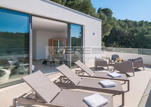 Diese außergewöhnliche, in erster Meerreihe gelegene, Villa beeindruckt durch Ihre besondere Kombination von einzigartiger und moderner Architektur mit sehr hochwertigen Materialien und erstklassiger Ausstattung und den atemberaubenden Meerblick, was ohne Zweifel fast keine Wünsche offen lässt. Die lichtdurchfluteten Räume bieten aufgrund der großen Fensterflächen allesamt traumhafte Ausblicke auf das Meer. Riesige Fensterflächen lenken den Blick nach Außen, auf das darunter liegende Meer und auf die überdachten und offenen Terrassen sowie zum Pool. Die Immobilie liegt am Rande der Bauzone in einer traumhaften Bucht. Ein wahres Highlight ist der schöne Kiesstrand direkt unterhalb der Villa. Die Liegenschaft ist eines der spektakulärsten Privathäuser im Mittelmeerraum, welche durch Bauqualität, Großzügigkeit aller Räumlichkeiten und absolute Privatsphäre fasziniert. In Verbindung mit der Nähe zum charmanten alten Ortskerns des Küstenortes Splitska (1 km) mit zahlreichen gemütlichen Konobas und Restaurants bietet diese Villa einen einzigartigen mediteranen Lifestyle in Herzen Dalmatiens.