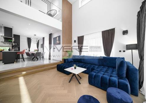 Das spektakuläre Design verbindet das Interieur mit den Gärten, den großen Terrassen und dem großen Pool mit 35 m². Breite Transparenz und große Fenster erlauben Licht und Luft durch das ganze Anwesen zu fließen. Bei der sehr professionellen Planung wurde neben der Funktionalität vor allem auf ein offenes Raumkonzept geachtet, bei dem die Grenzen zwischen Innen und Außen fließend sind. Die Wohnfläche ist auf drei Ebenen aufgeteilt. Der Keller bietet einen Technikraum mit Wäscherei, Abstellraum (Speisekammer), ein privates Fitnessstudio mit eingebauter Sauna und Dusche, sowie einen Aufenthaltsraum, der als Weinkeller und Spielzimmer (Billard, Tischfußball, Tischtennis) gedacht ist. Das Erdgeschoß bietet neben den hellen Wohn- und Essbereich mit offener Küche, ein Schlafzimmer sowie ein Badezimmer und eine Doppelgarage. Der Essbereich geht nahtlos in die teilweise überdachte Aussenterrasse über, an die sich die Sonnenterrasse mit Pool und separatem Whirlpool anschließt. Darüber hinaus bietet der Außenbereich einen Außengrill und eine Grünfläche mit Kinderspielplatz. Das Wohnzimmer sollte im Erdgeschoss hervorgehoben werden, dessen Raumhöhe sich über beide Etagen erstreckt und somit ein offenes Raumgefühl und zusätzlichen Luxus erzeugt. Im Obergeschoss befinden sich drei Schlafzimmer, zwei Bäder, eine geräumige begehbare Garderobe mit zwei überdimensionierten Einbauschränken von 435 x 290 cm und eine offene Galerie mit Blick auf das Wohnzimmer. Der Master - Bedroom verfügt über ein Badezimmer en suite, während sich die beiden anderen Schlafzimmer ein zweites Badezimmer im Obergeschoss teilen. Die gesamte Villa ist mit Fußbodenheizung ausgestattet, die über eine Wärmepumpe und Sonnenkollektoren versorgt wird und zudem vollkommen klimatisiert. Die Klimageräte sind nicht sichtbar, sondern als Fan-Coiler in die abgehängte Decke integriert. Das Haus verfügt über ein zusätzliches Alarmsystem und ist mit einen Smart Home System ausgestattet, das optional die Heizung, Klimatisierung, Beleuchtung, die Rollläden, Gegensprechanlage und Kameras über ein Smartphone oder einen zentralen LCD-Bildschirm im Erdgeschoss steuern kann. Im Preis inbegriffen ist die gesamte Möblierung dieser attraktiven Villa.