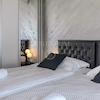 Im Erdgeschoss befinden sich drei Schlafzimmer, von denen eines über ein eigenes Badezimmer verfügt, während sich die anderen beiden das verbleibende Badezimmer teilen. Außerdem gibt es eine Wellnessoase mit Zugang zum Pool, Indoor-Massagebecken, Sauna und Badezimmer.