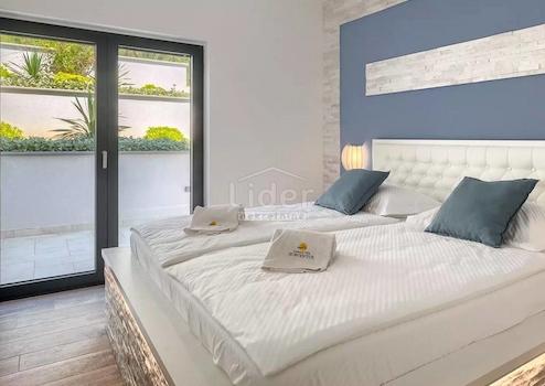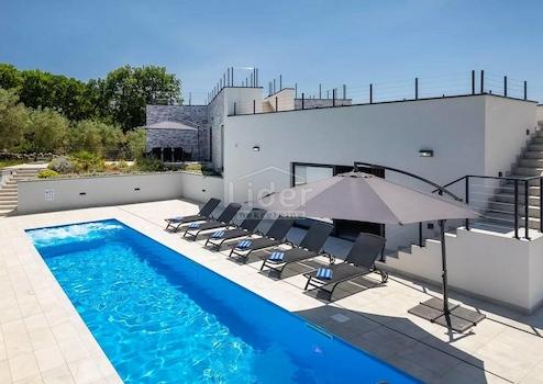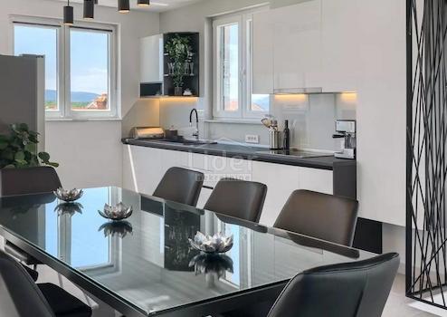 Das Haus liegt auf einem Grundstück von 1150 m2 und besteht aus einem Erdgeschoss, einem Zwischengeschoss und einem ersten Stock. Das Erdgeschoss besteht aus 3 Zimmern, zwei Badezimmern, Maschinenraum, Keller und Lagerräumen. Im Zwischengeschoss befindet sich ein Wellnesscenter mit Bad. Der Wellnessbereich ist mit einem Whirlpool und einer kleinen Sauna ausgestattet, die direkt auf eine große Terrasse (Sonnenliege) mit Swimmingpool führt. Im ersten Stock gibt es eine Küche mit Esszimmer, ein kleines Badezimmer, ein Wohnzimmer, eine teilweise überdachte Terrasse und einen Ausgang zu einer großen Terrasse mit Blick auf den Pool. Das Flachdach ist dekoriert (Keramik + Zaun) und kann als Sonnendeck/Terrasse genutzt werden. Von den Dachterrassen hat man einen wunderschönen Blick auf die Kvarner-Bucht (in Richtung der Stadt Rijeka und der Insel Cres). Das Haus verfügt über einen Pool von 12 x 3 Metern (42 m²) mit zwei Betten, einer eingebauten Installation für Hydromassage und einem Wasserfall. Der Zugang zum Pool erfolgt über Betonstufen.