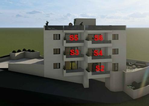 Apartment S5 verfügt über zwei Schlafzimmer, ein Badezimmer, eine Eingangshalle und eine Küche mit Esszimmer und ein Wohnzimmer mit Zugang zur Terrasse.