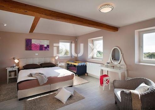 Die Renaissancestadt Svetvinčenat ist eines der Juwelen Istriens mit einem reichen touristischen Angebot und zahlreichen Veranstaltungen, die in den außerordentlich attraktiven historischen Räumen dieser Stadt stattfinden. Savičenta ist mit dem Renaissance-Platz „Placa“ mit der Morosini-Grimani-Burg geschmückt, dem Symbol des Ortes selbst und einer der wichtigsten Festungen der damaligen venezianischen Armee in Istrien. Ein wichtiger Teil des kulturellen Erbes von Svetvinčent sind die erhaltenen und hochgeschätzten Überreste der Wandfresken, die in der kleinen Kirche St. Vinzenz in der Nähe des Stadtfriedhofs und in der Kirche St. Katharina. Diese besondere Stadt mit einer reichen Tradition, ihren interessanten und vielfältigen Programmen, von denen das Mittelalterfest, das Käsefest und das Tanz- und Nonverbale-Theater-Festival die bedeutendsten sind, zieht jedes Jahr zahlreiche Besucher an. Diese Luxusvilla befindet sich in einem ruhigen, kleineren Ort in der Nähe von Svetvinčent, fast isoliert, wenn man bedenkt, dass sie nur von zwei Ferienhäusern und Natur und Grün umgeben ist. Es liegt in unmittelbarer Nähe der touristischen Zentren Istriens. Die Villa befindet sich auf einem Grundstück von 1702 m2, wovon 1367 m2 zum Garten gehören, während sich auf dem Rest des Grundstücks eine Villa, ein Swimmingpool, ein Nebengebäude mit Bad und ausreichend Platz zum Parken befinden. Die Villa selbst besteht aus einem offenen Raum mit Küche, Esszimmer und Wohnzimmer mit Kamin und Zugang zur Terrasse, zum Sonnenbereich, zum Swimmingpool und zur Sommerküche. Im Erdgeschoss des Hauses befinden sich zwei Schlafzimmer, ein Gäste-WC und zwei Badezimmer, während sich im ersten Stock des Hauses ein weiteres Schlafzimmer und ein Badezimmer befinden. Die Beheizung des Hauses erfolgt über eine Fußbodenheizung, für die Kühlung sorgen fünf Klimaanlagen. Diese Villa befindet sich in einer erfolgreichen Touristenvermietung und stellt daher eine sichere Kapitalrendite dar, während sie aufgrund des Luxus und der Privatsphäre, die sie bietet, das Traumhaus oder eine Traumurlaubsoase für jemand anderen sein könnte.
