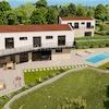 Im Garten gibt es einen beheizten Pool von 46 m2, eine Liegewiese, einen Loungebereich mit zentralem Kamin und drei Parkplätze (45 m2).