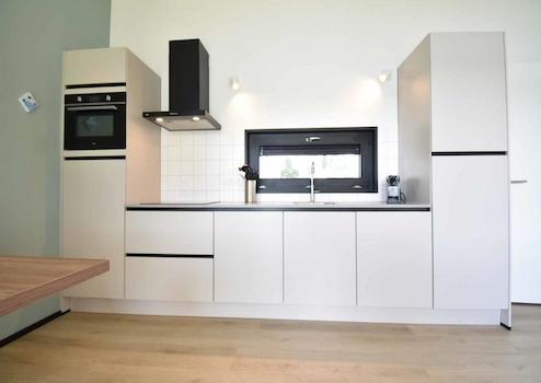 Schöne moderne Küche in einer aufrechten Anordnung. Dieser Queue enthält einen Quooker für heißes Wasser. Außerdem ist diese Küche komplett ausgestattet. Schwarze Dunstabzugshaube, Kühlschrank mit Gefrierfach, Induktionskochfeld und Geschirrspüler.