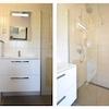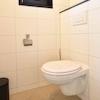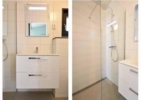 Badezimmer mit Badezimmerschrank zur Aufbewahrung von Toilettenartikeln. Spiegel mit eingebauter Beleuchtung. Begehbare Dusche und eine hängende Toilette.