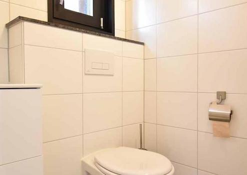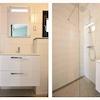 Badezimmer mit Badezimmerschrank, hängender Toilette und begehbarer Dusche