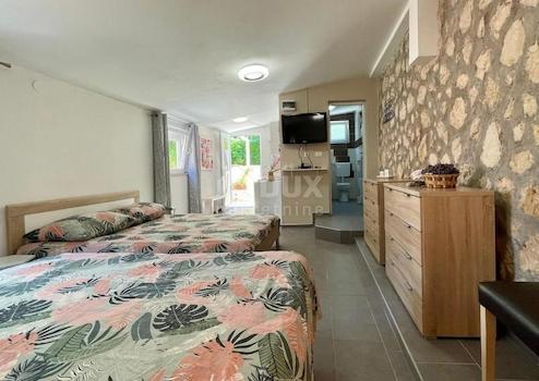 Wir verkaufen dieses schöne Apartmenthaus auf einem Grundstück von 1270 m2, in guter Lage im Zentrum von Novalja, nur 300 Meter vom Meer entfernt. Das Haus ist in ein Erdgeschoss und ein Obergeschoss mit dazugehörigem Nebengebäude aufgeteilt, in dem sich zwei Studio-Apartments mit jeweils eigener Terrasse und separatem Eingang befinden. Im Haupthaus verfügen wir über drei Wohnungen, von denen sich zwei im Erdgeschoss befinden, während wir im ersten Stock des Hauses eine Dreizimmerwohnung mit großzügiger Terrasse haben. Im weitläufigen und gepflegten Garten stehen 7 Olivenbäume, vier Mandelbäume und viele mediterrane Pflanzen. Wir haben Parkplätze für acht Autos im Garten. Eine ausgezeichnete Immobilie, eine ideale Investition für eine touristische Vermietung, bei der die Belegung während der gesamten Saison garantiert ist.