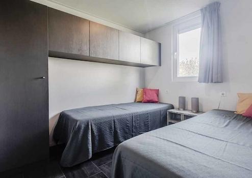 Dieses Schlafzimmer hat 2 separate Boxspringbetten. Um Platz zu sparen, sind die Schränke aufgehängt.