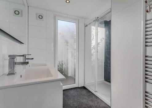 Dieses Badezimmer ist sehr geräumig. Große Duschkabine mit regen Duschkopf und ein Doppelwaschbecken mit Waschbecken Schrank.