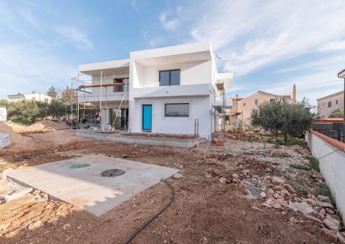 Neue Doppelhaushälfte zum Verkauf in Vodice. Es besteht aus Erdgeschoss und Obergeschoss. Im Erdgeschoss befindet sich ein Wohnzimmer mit Küche und Esszimmer in einer Einheit, eine Toilette, ein Abstellraum und eine großzügige Terrasse, vor der sich ein Garten befindet. Der erste Stock ist über eine Innentreppe zugänglich und es gibt drei Schlafzimmer, zwei Badezimmer, und zwei überdachte Terrassen. Das Haus hat auch zwei Parkplätze. Es befindet sich in ruhiger Lage und in der Nähe aller Annehmlichkeiten, die für ein qualitativ hochwertiges Leben erforderlich sind. Die geplante Baufertigstellung ist 2024. Auf Wunsch des Kunden kann gegen Aufpreis ein Außenpool im Hof installiert werden.