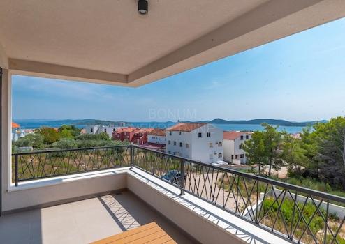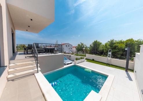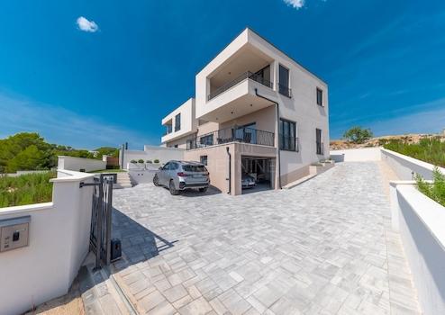 Zum Verkauf steht ein wunderschönes modernes Haus mit privatem Pool und Panoramablick auf das Meer, in idealer Lage in Vodice, nur wenige Gehminuten vom Strand und dem Stadtzentrum entfernt.