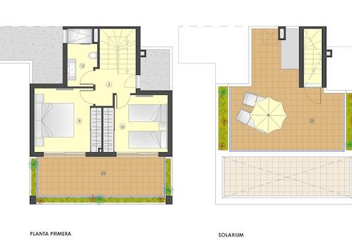 Die hochwertige Ausstattung der Wohneinheiten beinhaltet PVC-Fenster und -Türen mit Doppelverglasung und sogenannten Mallorquinas (Fensterläden), gepanzerte Wohnungstüren, Sicherheitsgitter im Erdgeschoss, Einbauküchen mit Ober- und Unterschränken und Dunstabzugshaube, erstklassige Sanitärobjekte, elektrische Fußbodenheizung in Bädern, Klimaanlage, Breitband-Glasfaseranschlüsse für die Telekommunikationsdienste in den Wohn-und Schlafzimmern. Die privaten Gärten werden angelegt und mit einem automatischen Bewässerungssystem versehen und auf den Dachterrassen werden eine Außendusche und ein Wasserhahn installiert. Sämtliche Häuser verfügen zudem über zwei Kfz-Stellplätze auf dem Grundstück und ein Privatpool ist optional.