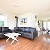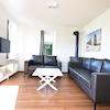 Das gemütliche und ansprechend eingerichtete Wohnzimmer strahlt eine angenehme Atmosphäre aus. Das Wohnzimmer ist in einen Sitz- und einen Essbereich unterteilt. Dieser Raum ist mit Heizkörpern ausgestattet und durch die Fenster und Gartentüren fällt viel Licht in den Raum. Die Decke und die Wände sind in einer hellen Farbe gehalten, die einen schönen Kontrast zum holzfarbenen Boden bildet.