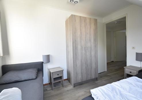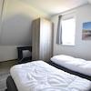 Dieses Schlafzimmer bietet Platz für 2 Betten. Das Fenster kann vollständig geöffnet werden und ist mit einem Lüftungsgitter ausgestattet. Natürlich ist auch dieses Zimmer mit einem Heizkörper, Nachttisch und Stehlampen ausgestattet.