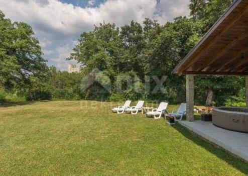 Pazin, das unvermeidliche Herz Istriens, der Sitz der Gespanschaft Istrien, wo die Einwohner unternehmungslustig und komfortabel leben. Sicher und offen, eine auf den Menschen zugeschnittene Stadt, ein Bildungs- und Kulturzentrum, das die istrische Identität bewahrt und die Tradition nutzt, um neue Werte zu schaffen. Dieses charmante Ferienhaus mit Pool (28m2) und Jacuzzi liegt im Zentrum von Istrien. Das Haus befindet sich in ruhiger Lage, umgeben von gepflegtem Garten, Vegetation und viel Grün. Es besteht aus zwei Etagen. Das Erdgeschoss verfügt über eine voll ausgestattete Küche, ein klimatisiertes Wohnzimmer und ein Badezimmer mit Dusche. Das Wohnzimmer hat direkten Zugang zu einem wunderschön angelegten Garten, in dem sich ein Whirlpool und eine geräumige überdachte Terrasse sowie ein Grill befinden. Innentreppen führen in den zweiten Stock, wo sich zwei klimatisierte Schlafzimmer und ein Badezimmer mit Dusche befinden. Der schön angelegte Garten, die Lage des Gebäudes und der private Pool und Whirlpool in idyllischer grüner Umgebung sind ideal für die Vermietung oder das Familienleben.
