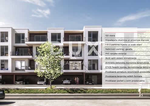 Wir präsentieren Ihnen stolz ein exklusives Apartment mit zwei Schlafzimmern und Aufzug in einem der prestigeträchtigsten Neubauten in Umag. Diese großzügige Wohnung mit einer Gesamtfläche von 60 m2 befindet sich im ersten Stock dieses imposanten Wohnhauses. Das Apartment bietet Eleganz und Komfort und besteht aus einem geräumigen Wohnzimmer mit moderner Küche, zwei luxuriösen Schlafzimmern, einem eleganten Badezimmer und einem 7 Quadratmeter großen Balkon. Die Wohnung verfügt außerdem über eine Abstellfläche von 2,67 m2, einen überdachten Parkplatz und einen Garagenstellplatz, was Ihren Alltag äußerst praktisch macht. Dieses Apartmenthaus wurde mit professionellem Ansatz und Liebe zum Detail gebaut. Das Gebäude besteht aus einer monolithischen Stahlbetonkonstruktion mit Mezzaninplatten für zusätzliche Sicherheit und Stabilität. Im Inneren der Wohnungen sind Trennwände mit Gipskartonplatten in doppelter Stärke ausgeführt, die für eine hervorragende Wärme- und Schalldämmung sorgen. Die Fassadenverkleidung erfolgt im WDVS-System mit einer 10 cm dicken Wärmedämmung und sorgt so für Energieeffizienz. Hochwertige PVC-Zimmerei der neuen Generation mit elektrischen Jalousien bietet zusätzlichen Komfort und Sicherheit. Jede Wohnung ist mit einem Top-Multisplit-Heiz- und Kühlsystem ausgestattet, das für perfekte Temperatur und Wirtschaftlichkeit sorgt. Die Wohnungen verfügen über eigene Wasser- und Stromzähler und die Warmwasserbereitung erfolgt über einen Elektroboiler. Darüber hinaus verfügt jede Wohnung über einen Telefon-, Antennen-, TV- und Internetanschluss sowie eine integrierte Video-Gegensprechanlage für mehr Sicherheit. Die Wohnung ist in den Zimmern und im Wohnzimmer mit hochwertigem Parkett ausgelegt, während die Flure und Dielen mit edlen Fliesen ausgestattet sind. Mit hochwertigsten Materialien und Ausstattung bietet diese Wohnung nicht nur außergewöhnlichen Wohnkomfort, sondern eignet sich auch ideal zur Vermietung für touristische Zwecke. Die geplante Baufertigstellung ist Mitte 2025, sodass Sie schnell alle Vorzüge dieser Luxuswohnung genießen können. Die Lage ist perfekt, nur 700 Meter vom Meer und dem Zentrum von Umag entfernt, sodass Sie den ganzen Charme dieser wunderschönen mediterranen Stadt genießen können. Allgemeine Spezifikationen des Gebäudes: Erdgeschoss: - 1x Studio-Apartment mit Garten - 18x Apartments mit einem Schlafzimmer, Wohnzimmer, Terrasse und Garten - 5x Apartments mit zwei Schlafzimmern, Wohnzimmer, Terrasse und Garten - 43x Abstellraum 1. Stock: - 26x Wohnungen mit einem Schlafzimmer, Wohnzimmer, Terrasse und Garten - 7x Wohnungen mit zwei Schlafzimmern, Wohnzimmer, Terrasse und Garten - 16x Abstellraum 2. Etage: - 26x Wohnungen mit einem Schlafzimmer, Wohnzimmer, Terrasse und Garten - 7x Wohnungen mit zwei Schlafzimmer, Wohnzimmer, Terrasse und Garten - 16x Abstellraum 3. Etage: - 24x Wohnungen mit einem Schlafzimmer, Wohnzimmer und Balkon - 7x Wohnungen mit zwei Schlafzimmern, Wohnzimmer und Balkon - 1x Wohnung mit drei Schlafzimmern, Wohnzimmer, Balkon und Loggia - 14x Lagerraum Tiefgarage: - 74 Parkplätze - 33 Lagerplätze Tiefgarage: - 26 überdachte Parkplätze - 82 nicht überdachte Parkplätze Verpassen Sie nicht die Gelegenheit, stolzer Besitzer dieser Luxuswohnung in Umag zu werden und ein exklusives Lebenserlebnis zu genießen einer der attraktivsten Neubauten auf dem Markt. Für weitere Informationen und eine Besichtigung der Wohnung kontaktieren Sie noch heute unsere Agentur. Sehr geehrte Kunden, die Vermittlungsprovision wird gemäß den Allgemeinen Geschäftsbedingungen berechnet. www.dux-nekretnine.hr/opci-uvjeti-poslovanja