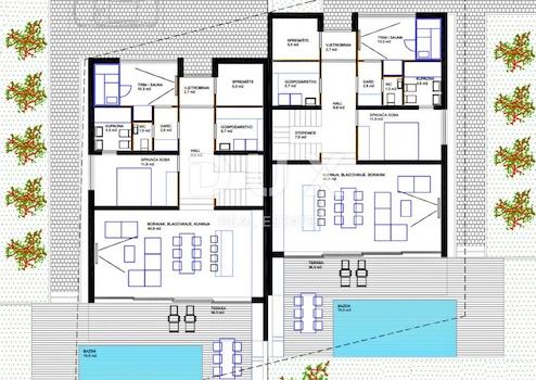 Umgeben von einem angenehmen mediterranen Klima, im Herzen der Westküste Istriens, der antiken Stadt Poreč und ihrer Küste mit erhaltener natürlicher Schönheit, Landschaftsparks, Pinien- und Eichenhainen, die bis zum Meer reichen Das Meer selbst, an dem sich das klare Meer abwechselt, erstreckt sich über eine Fläche von 139 km² und besteht aus 58 Siedlungen. Mit der Identität einer urbanen Küstenstadt ist Poreč eine Stadt der Kultur, des Sports, der Unterhaltung, des Tourismus und der echten Gastfreundschaft. Eine der attraktivsten Städte des kroatischen Tourismus, die auf einzigartige Weise die natürliche Schönheit Istriens, das reiche kulturelle und historische Erbe und die modernsten Annehmlichkeiten eines Top-Reiseziels vereint. Die Harmonie des alten Stadtkerns, der ein Kulturdenkmal ist, mit einem der berühmtesten istrischen Kulturdenkmäler, der Euphrasius-Basilika, die auf der Liste des UNESCO-Weltkulturerbes steht, und den am besten organisierten und am besten ausgestatteten Touristenorten an der Adria bildet sich ein Mosaik unvergesslicher Erlebnisse. Poreč ist auch eine Stadt, die viel mehr ist als ein Sommerziel voller Sonne und Meer. Poreč ist eine auf den Menschen zugeschnittene Stadt. Eine Stadt, in der es einen ständigen Impuls für bessere Lebensbedingungen und größeren Fortschritt in verschiedenen Bereichen gibt. Eine Stadt, die ein angenehmer, sicherer und gut organisierter Ort zum Leben ist, in der jeder seinen Platz findet, eine Stadt ohne Zuschläge mit hoher sozialer Sensibilität für alle Generationen. Nahe dem Zentrum von Poreč, nur 2 Kilometer vom Meer entfernt, stehen zwei Häuser mit Swimmingpool zum Verkauf. Neben der verkehrsgünstigen Lage zeichnet sich die Immobilie durch Bauqualität und modernes Design aus, das sich durch eine regelmäßige geometrische Form und regelmäßige Linien im Raum sowie einen Innenraum mit kompaktem Grundriss und luftigen Räumen auszeichnet. Das Projekt sieht den Bau von zwei Doppelhäusern mit eigenen Schwimmbädern und Gärten vor. Jedes Gebäude ist als einstöckiges Haus mit einer Wohneinheit mit einer Wohnfläche von 191,5 m² konzipiert, die sich über das Erdgeschoss und das erste Obergeschoss erstreckt. Im Erdgeschoss beider Häuser befindet sich ein offener Raum, der Küche, Esszimmer und Wohnzimmer mit Zugang zu einer überdachten Terrasse vereint, ein Wellnessbereich mit Sauna, Ankleidezimmer und Toilette, ein Schlafzimmer mit eigenem Bad, eine Waschküche Zimmer und ein Abstellraum. Im ersten Stock beider Häuser befinden sich eine Eingangshalle mit Zugang zur Loggia und vier Schlafzimmer mit eigenem Bad, von denen zwei Zugang zu einem großzügigen Balkon haben. Vollkommene Harmonie und Komfort werden durch minimalistische Gartengrundstücke erreicht, die beide über einen 19 m² großen Swimmingpool mit Sonnendeck verfügen. Die Lage, Struktur und der Komfort machen diese Immobilie zu einer idealen Gelegenheit für ein ruhiges Familienleben sowie zu einer Investition zur touristischen Vermietung. Der angegebene Preis bezieht sich auf die Phase des niedrigen Rohbauzustandes. Sehr geehrte Kunden, die Agenturprovision wird gemäß den Allgemeinen Geschäftsbedingungen berechnet: www.dux-nekretnine.hr/opci-uvjeti-poslovanja