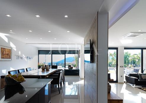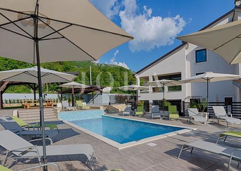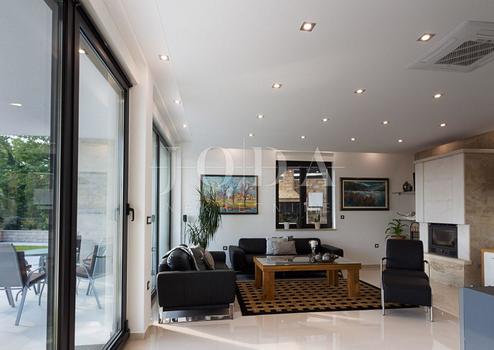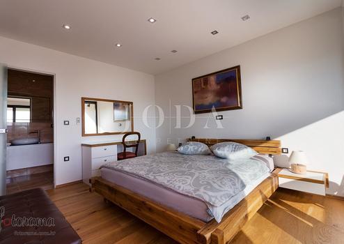 Beautiful modern vila on a quiet location. Characterized by its unique design, this contemporary villa offers unparalleled style and functionality. Villa extends to 350 sqm and it consists of a groundfloor, first and second floor. Three bedrooms with private bathrooms occupies the first floor, while on the second floor there is a one-bedroom apartment. Spacious living room and top quality equipped kitchen with dining area area on the groundfloor with a indoor swimming pool and sauna.