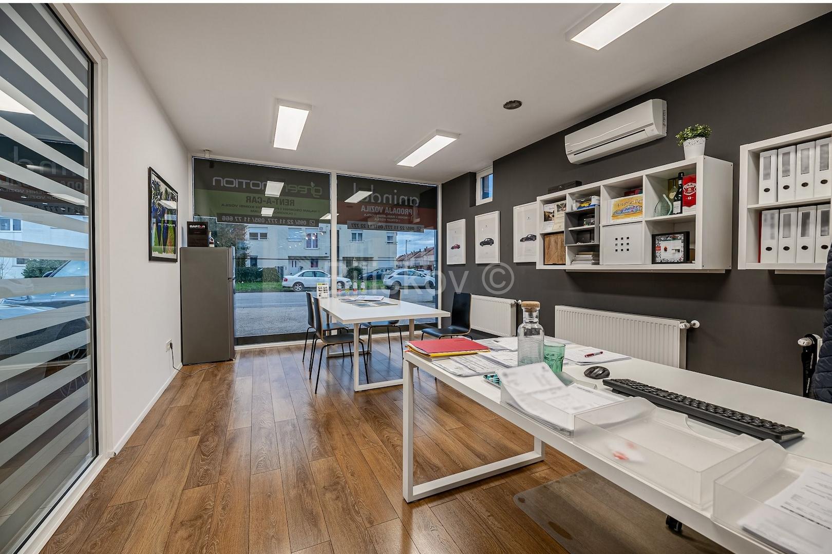Erdgeschoss: Haupteingang zum Treppenhaus des Gebäudes und Eingang zum Bereich (derzeit ein Autohaus/eine Autovermietung), Toilette und Kochnische. Der Boden ist mit hochwertiger Keramik ausgelegt und die Decke ist „Knauf“ mit integrierter LED-Beleuchtung, der Raum ist klimatisiert (170 m2).