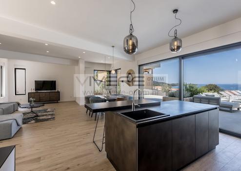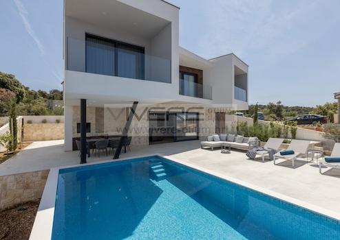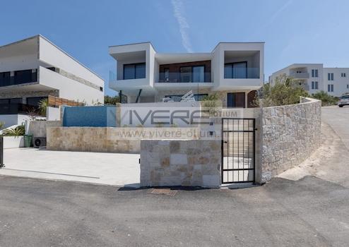 Die Villa präsentiert sich in einem modernen und geschmackvollen Design. Sie wurde gut durchdacht und bietet seinen zukünftigen Bewohnern Komfort auf hohem Niveau. Am Eingang des Anwesens befinden sich drei Außenparkplätze. Eine Steintreppe führt Sie zur großzügigen Terrasse der Villa und zum Haupteingang. Die Wohnfläche der Villa erstreckt sich über zwei Etagen. Eine lichtdurchflutete großzügige Raumaufteilung bietet im Erdgeschoss einen großen Wohn- und Essbereich und eine offene Küche, die sich zu einer sonnigen Terrasse mit beheiztem Infinity-Pool von 30 m² öffnet, der von Sonnenliegen und einer Schaukel umgeben ist, um beim Sonnenbaden den schönen Blick auf das Meer zu genießen. Zusätzlich bietet die Terrasse eine Sommerküche mit Steingrill und einen Essbereich im Freien. Abgerundet wird das Angebot im Erdgeschoss durch einen Waschraum mit Waschmaschine und Trockner sowie ein Gäste-WC. Im ersten Obergeschoß befinden sich drei Schlafzimmer mit jeweils eigenen Badezimmer en-suite. Alle Schlafzimmer haben Zugang zu privaten überdachten Balkonen, von denen sich ein herrlicher Meerblick bietet. Sämtliche Materialien und die Ausstattung sind sorgfältig für höchste Ansprüche an Qualität, Funktion und Komfort ausgewählt. Die Villa ist hochwertig möbliert, komplett klimatisiert und mit solarer Warmwasserversorgung ausgestattet.